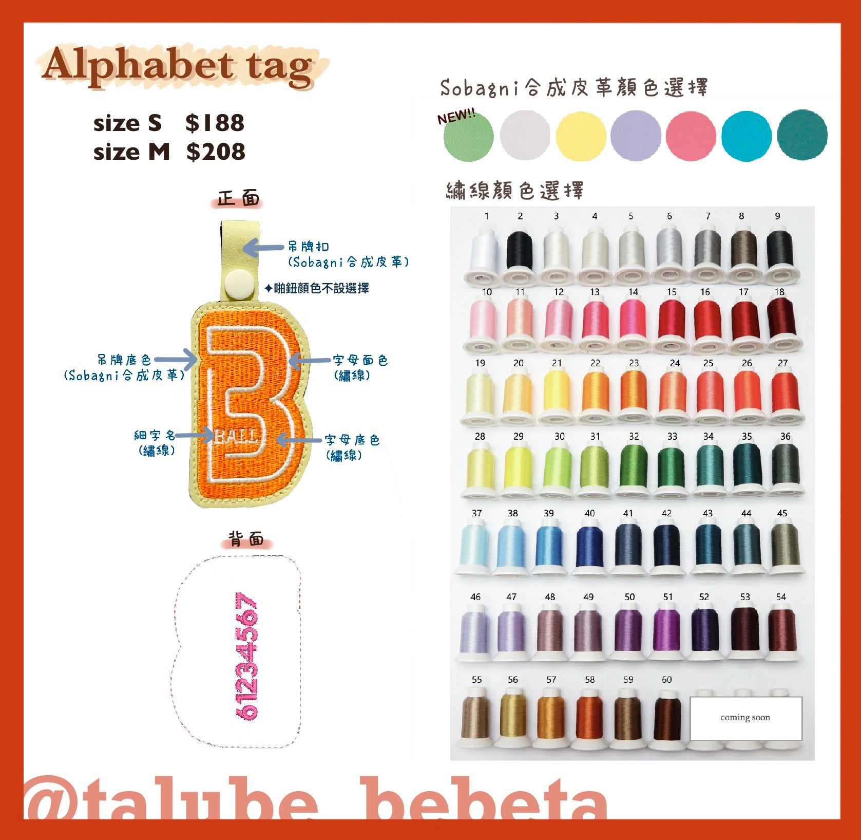 Alphabet Tag是用Sobagni人造皮革製作的刺繡名牌,背面可繡上主人的聯絡電話。